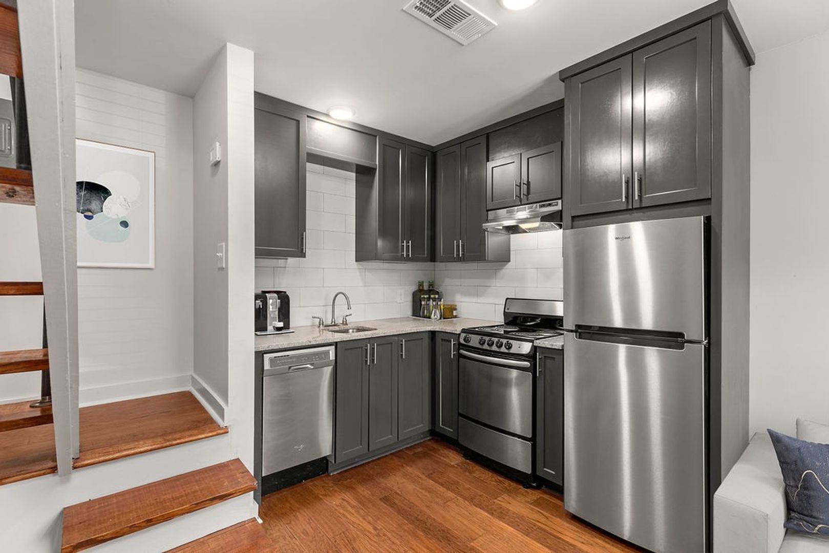 With LVP wood floors, the living area and kitchen are the first things through the front door. The kitchen has an island with bar seating, new stainless-steel appliances, all new fixtures, granite countertops, and new cabinets! Next up is the bathroom, updated with a new vanity, tile work, and all new fixtures. The bedroom is at the end of the hallway, with a ceiling fan, walk-in closet, and additional linen closet.