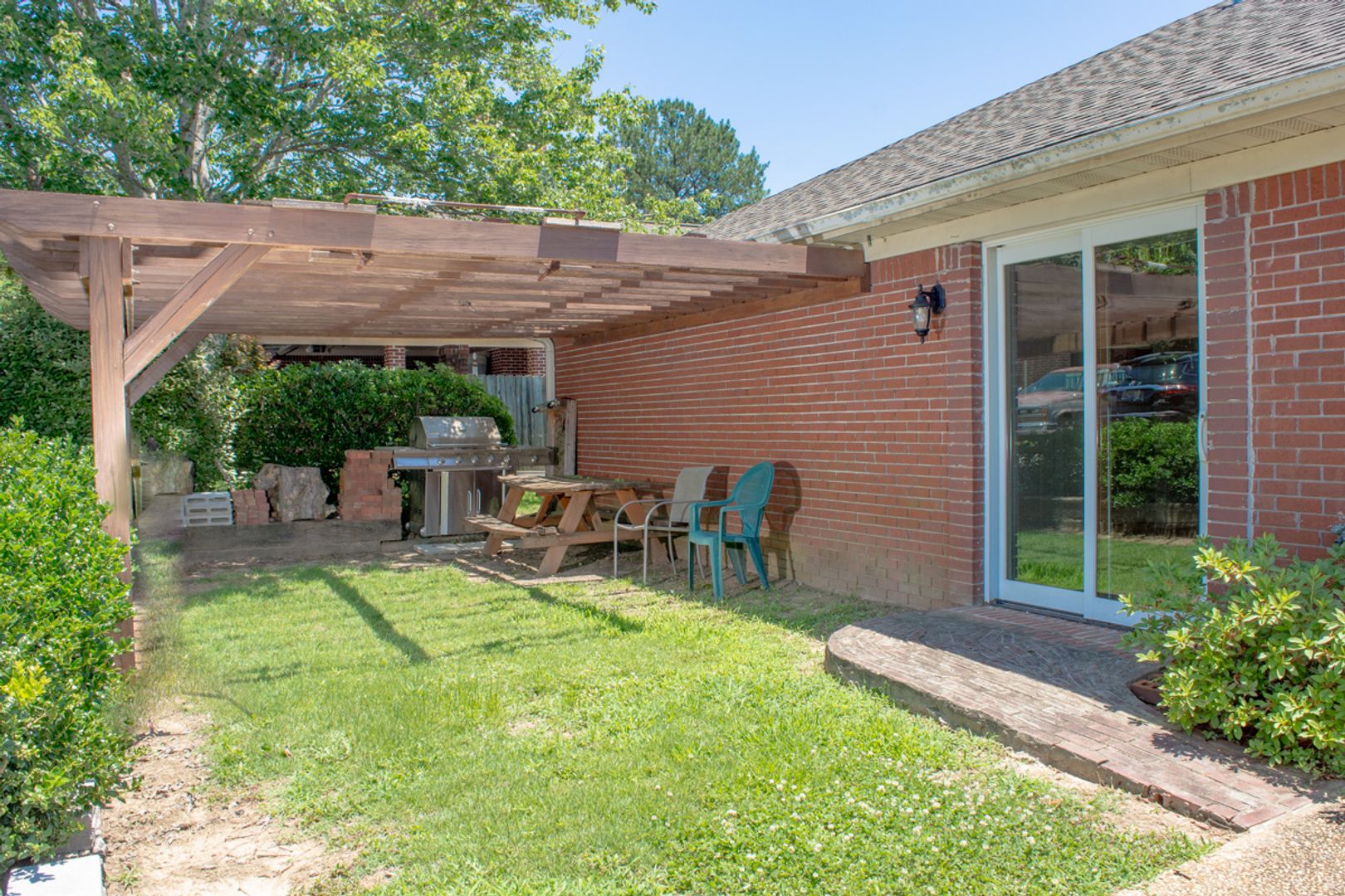 Home features a sprawling floorplan with a large den and living room. Master bedroom features en suite bathroom. Large garage (driveway for 2 cars) with terrific built in cabinetry. There is an outdoor patio space, perfect for grilling.